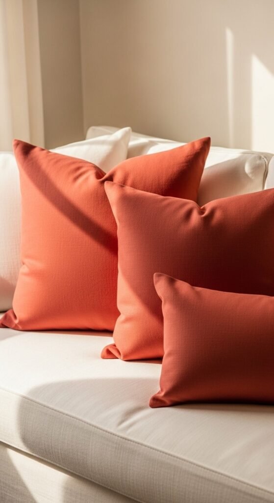 Deep coral cushions on a white or neutral sofa introduce warm, tropical color without requiring any permanent decorating decision. Coral sits between orange and pink — warm, energizing, and significantly more interesting than either standard orange or pink alone. It works particularly well in south or west-facing rooms where warm afternoon light intensifies and flatters the coral tone. Pair with white, cream, or soft teal accessories — coral and teal is one of the most reliably vibrant complementary pairings in interior color. Budget tip: coral velvet or linen cushion covers are available at most home stores for under $15 each.