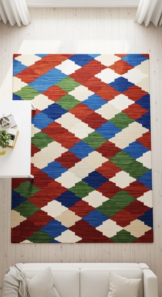A bold, multicolored patterned area rug is the single decorating element that can pull together an entire room’s color palette in one object. A kilim, Moroccan, or geometric rug with three to four saturated colors establishes the palette for every other color choice in the space. Pull individual accent colors from the rug pattern for cushions, ceramics, and art. This approach is foolproof — the rug has already done the color-pairing work. Budget tip: flat-weave kilim-style rugs in bold patterns are significantly cheaper than pile rugs and are widely available in genuinely beautiful designs from online retailers.
