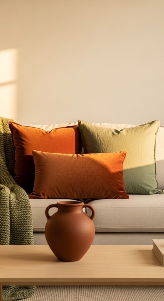 Sage green and rust are complementary earth tones that share the same underlying warmth — both have muted yellow-red undertones that make them harmonise naturally. Used together on a neutral background, they create a palette that feels organic, earthy, and lived-in. Introduce the combination through cushion covers, a knitted throw, and a single ceramic vase rather than furniture — this keeps the investment low and the palette adjustable. This color combination works particularly well in autumn and winter when warmer tones feel most resonant. Budget tip: sage and rust textiles are among the most widely available in affordable home stores.