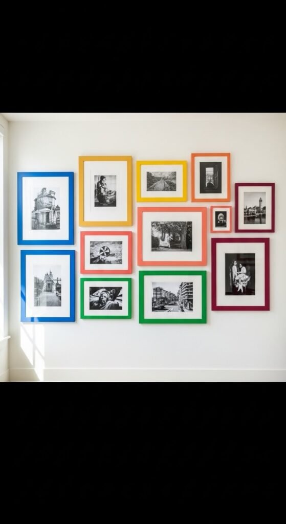 A gallery wall where the color comes from the frames rather than the artwork is a clever strategy that allows you to rotate and update artwork freely while maintaining consistent color impact. Use bold, saturated frame colors — cobalt, mustard, coral, and forest green — against a white wall with black and white photography inside each frame. The monochrome artwork inside the colored frames prevents the wall from becoming visually overwhelming. Budget tip: plain wooden frames from discount stores can be painted in any bold color with a small amount of chalk paint or acrylic — total cost per frame under $5.