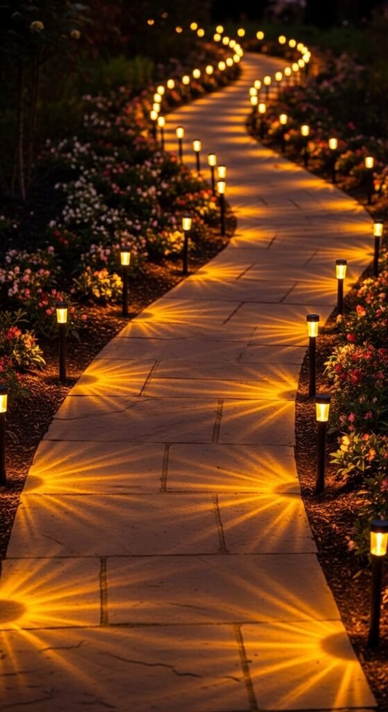 Solar-powered stake string lights placed along the edges of a garden path create practical wayfinding lighting after dark while also adding a warm, decorative quality that transforms a plain garden path into a feature of the evening garden. Use solar-powered stake lights specifically designed for path-edge installation — they charge during the day and switch on automatically at dusk without any power cable management. A set of ten solar path stake lights costs $15 to $30. Place stakes six to eight inches apart on both sides of the path for an even, balanced border of light. Replace after two to three years — solar panel efficiency degrades over time and the lights begin switching on later and off earlier as the panel weakens.