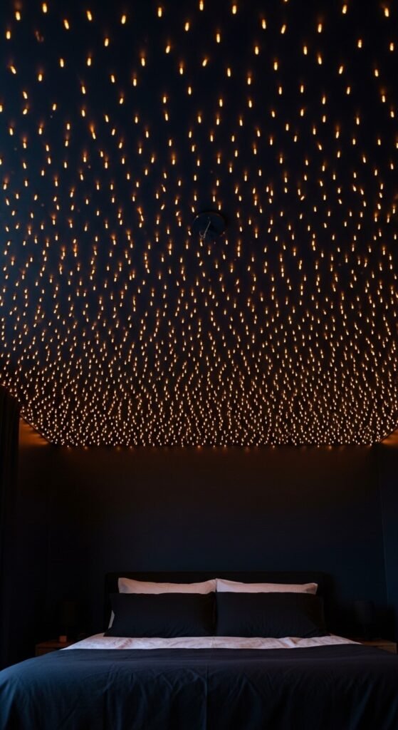 Covering an entire bedroom ceiling with micro string lights creates a starfield effect — a ceiling that looks like a clear night sky viewed from below and is arguably the most immersive string light installation possible in a domestic space. Use multiple 100-LED micro strands pinned to the ceiling with small adhesive hooks or staples, distributing the lights unevenly across the ceiling area for a more natural, random star pattern rather than a uniform grid. Paint the ceiling dark navy or charcoal before installation for maximum contrast. Five strands of 100 micro lights cover a standard 10×10 bedroom ceiling adequately. Total cost: $40 to $80. A dimmer plug controls the brightness from the bed.