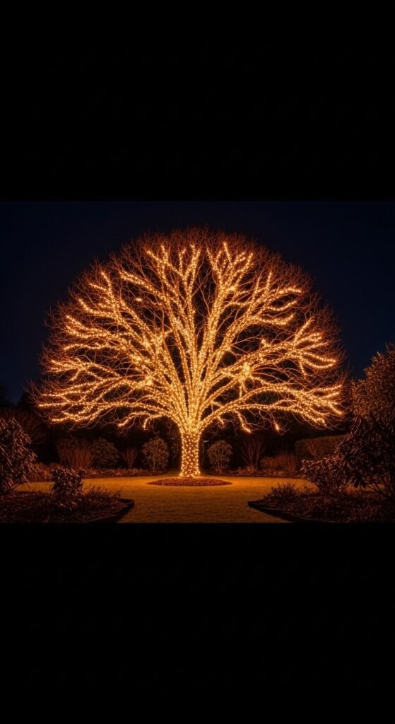 Wrapping outdoor tree branches in warm string lights is one of the most dramatic garden lighting effects available — a single large tree wrapped in warm amber lights becomes a glowing landmark that anchors the entire garden’s nighttime atmosphere. Wrap lights along main branches first, then move to secondary branches — the main structural lines of the tree create the most impact. Wind the strand loosely rather than pressing it tightly against the bark. Outdoor-rated LED string lights on a 48-foot strand cost $20 to $40. Use a weatherproof outdoor timer set to switch on at dusk and off at midnight. Bare winter trees produce an especially dramatic silhouette effect against a dark sky.