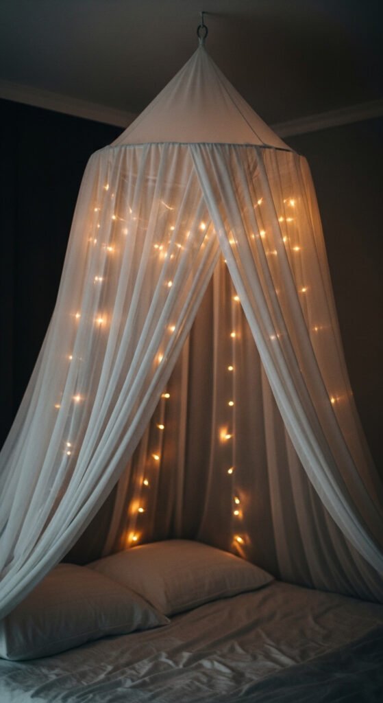 Four ceiling hooks above the bed corners, four sheer fabric panels draped from each hook, and a micro string strand woven through each panel creates a DIY bed canopy that looks genuinely luxurious and costs well under $50 to make. Fix four ceiling hooks in a rectangle above the bed — one above each corner. Cut four panels of white sheer or muslin fabric from a fabric store at $2 to $4 per meter and drape each from its corner hook down to the bed corner post or floor. Weave one 50-LED battery strand through each fabric panel. Total cost: $25 to $50. The combination of draped fabric and warm light through the sheer material creates the most atmospheric bedroom string light effect on this list.