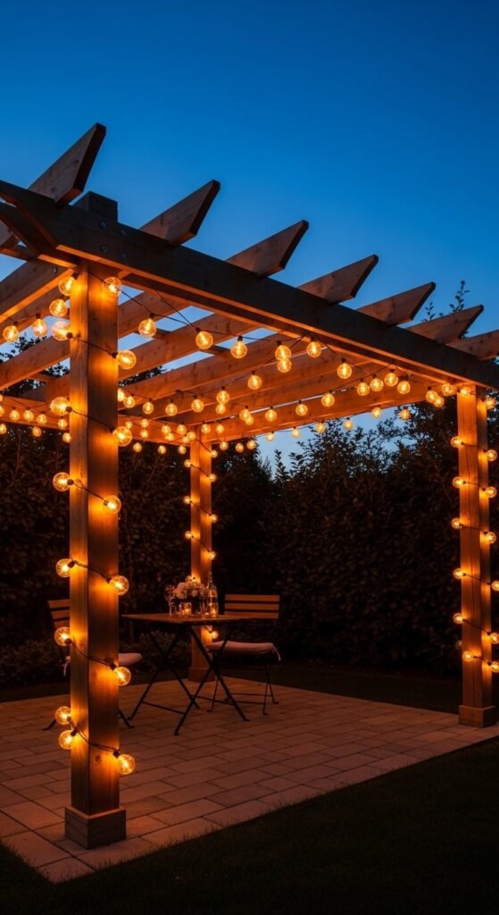 Wrapping string lights around a garden pergola — along the posts and across the overhead beams — transforms the structure from a plain garden feature into an illuminated outdoor room that functions as a destination in its own right after dark. Wrap vertical posts in a tight spiral from base to top, then string horizontal rows across the overhead beams at 18 to 24-inch intervals. Use globe bulb strands for the overhead rows and micro strands for the post wrapping — the variation in bulb size creates visual depth. Two 48-foot globe strands and two 20-foot micro strands cover a standard 10×10 pergola. Total cost: $50 to $80. Install on a timer set to dusk-to-midnight.