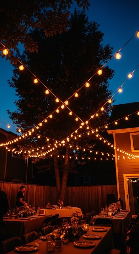 A criss-cross string light web above an outdoor party area — strung from multiple anchor points in irregular diagonal lines rather than parallel rows — creates a more festive, informal atmosphere than a structured canopy and can be assembled and taken down quickly for a single event. Use removable adhesive outdoor hooks on walls and fences for anchor points that leave no permanent marks. Extend lines between hooks in multiple directions, allowing natural sag. Five 48-foot strands create enough coverage for most backyard party setups. Total cost: $80 to $150 for a reusable full outdoor party lighting kit. Store strands wound on a cardboard reel in a labeled bag to prevent tangling.