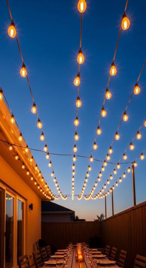 A string light canopy above an outdoor dining or seating area is one of the most atmospheric outdoor lighting installations possible — the parallel rows of warm globe lights above create an enclosed, intimate feeling outdoors that makes any evening gathering feel like a special occasion. String parallel rows of festoon lights between two opposing walls, fence posts, or eye-bolt anchors spaced approximately 18 to 24 inches apart. Allow a consistent sag between each anchor point — pulled tight, the lights look harsh; with a natural droop, they look relaxed and intentional. A 48-foot LED festoon string costs $20 to $40. Four to six parallel rows cover a standard patio completely.