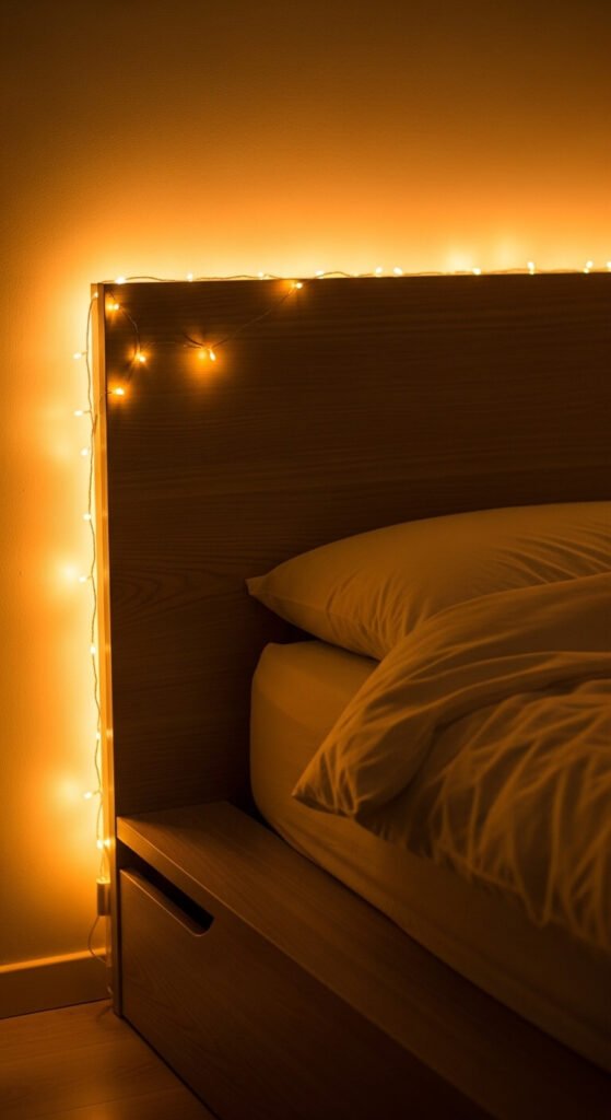Tucking a string light strand behind a headboard — between the headboard and the wall — creates a halo of warm glow that outlines the headboard shape and turns the entire bed wall into a softly illuminated architectural feature. Use an LED strip or a thin micro strand that sits flat against the wall behind the headboard without creating a visible bump. The light source should be completely hidden — only the glow around the headboard edges is visible. A 10-foot LED strip or a short micro strand costs $10 to $20. This is a simpler and more subtle effect than the above-headboard draping approach and works best with wooden or upholstered headboards that have some depth to conceal the light source.
