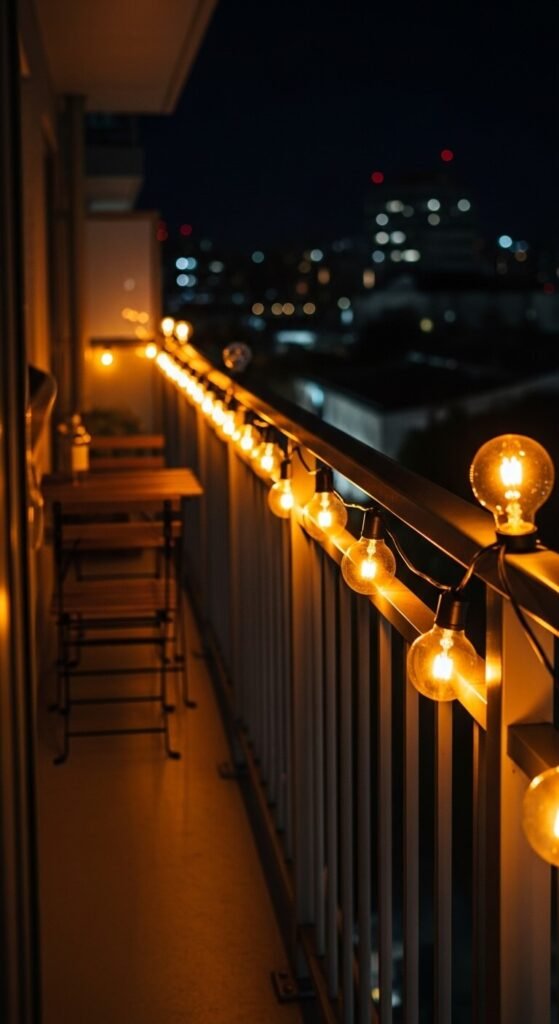 Wrapping string lights around a balcony railing transforms a plain apartment balcony into a warm outdoor room that is genuinely pleasant to sit in after dark — one of the most effective urban outdoor improvements achievable without building or structural changes. Use outdoor-rated string lights — balcony railings are exposed to weather even under a covered overhang, and indoor string lights fail quickly in exterior humidity. UV-resistant outdoor string lights cost $15 to $30 for a 25-foot strand. Use cable ties or wrap-around clips to attach the strand to the railing rather than tape — UV exposure degrades adhesive tape quickly outdoors. The lights plug into a standard outdoor outlet or extension cord run from inside.
