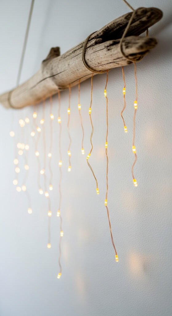 A driftwood piece mounted horizontally on the wall with micro string light strands hanging down from it creates a coastal, organic wall installation that functions as both art and ambient light simultaneously. Source a large piece of driftwood from a beach, river bank, or craft store and mount it to the wall with two picture hooks. Drape or staple five to ten short sections of warm micro light strand downward from the driftwood at irregular intervals and lengths. Coil the excess at the end of each strand into a loose loop. Total cost: $15 to $30 for the light strand plus free driftwood or $10 to $20 from a craft store. The piece looks handmade in a deliberately considered way.