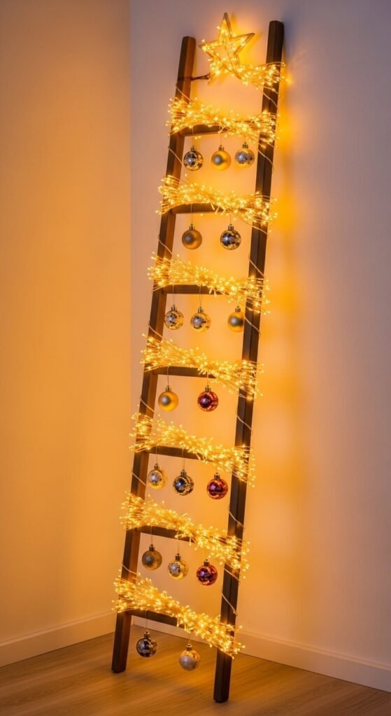 A decorated wooden ladder wrapped in dense string lights is a popular alternative to a traditional Christmas tree for apartments and small spaces — it provides a warm, festive string light centerpiece without requiring a stand, a large floor footprint, or a real or artificial tree. Wrap the ladder densely with 200 to 300 LED micro lights so the entire structure glows with warm amber light. Hang small ornament balls, paper stars, or dried orange slices from the rungs. A decorative wooden ladder costs $20 to $40 from most home stores. The light wrapping costs $15 to $25. Total: $35 to $65 for a reusable annual display.