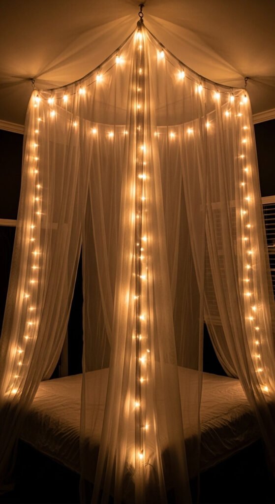 Draping string lights along the top rails of a canopy or four-poster bed frame — then allowing additional strands to hang down the inside of the corner posts — creates a bed that feels like a private, glowing sanctuary within the larger room. Fix the strand along the top horizontal rails of the canopy using small clear adhesive clips or wrap-around ties. Use a warm amber micro strand rather than globe lights for this application — the smaller bulbs create a more delicate, less commercial-looking effect on a bed frame. A canopy strand of 100 micro lights costs $10 to $18. A timer plug set to switch off at midnight handles the practical management automatically.
