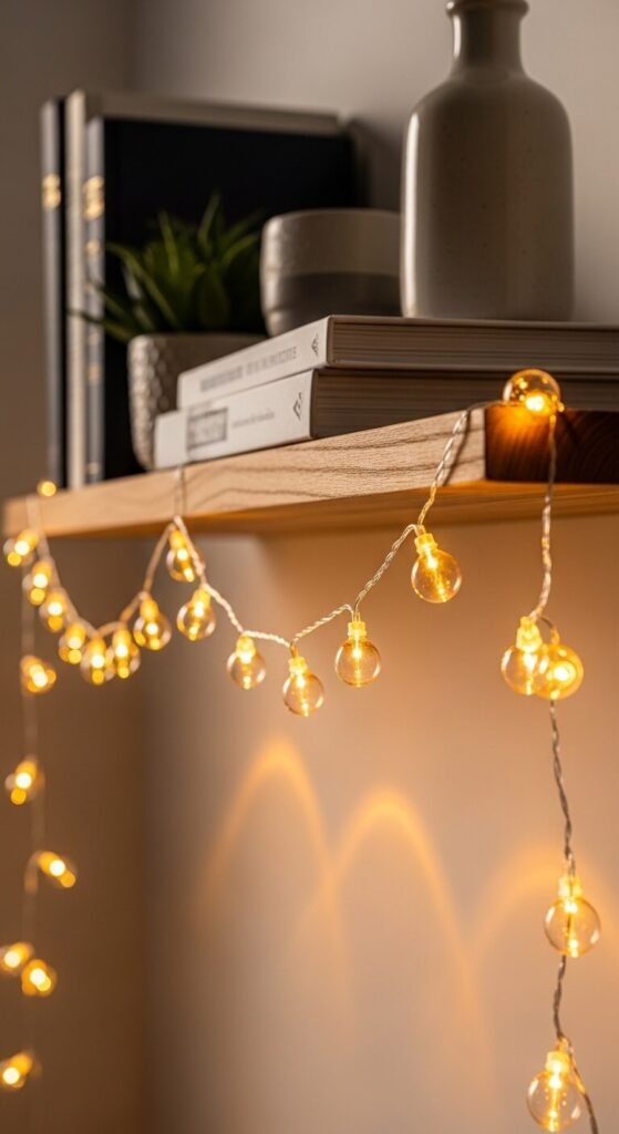 Draping a micro string strand along the front edge of a floating shelf — allowing it to hang in a gentle scalloped festoon below the shelf line — creates a warm trim effect that illuminates both the shelf objects above and the wall surface below simultaneously. Use a battery-operated strand so there is no power cable running down the wall from the shelf to an outlet below. Attach the strand to the shelf underside at each end with a small adhesive hook to control the drape shape. A 20-LED battery micro strand costs $6 to $12. Three shelves with matching light trims create a cohesive, warm bookcase effect for under $40 total. Replace batteries every six to eight weeks.