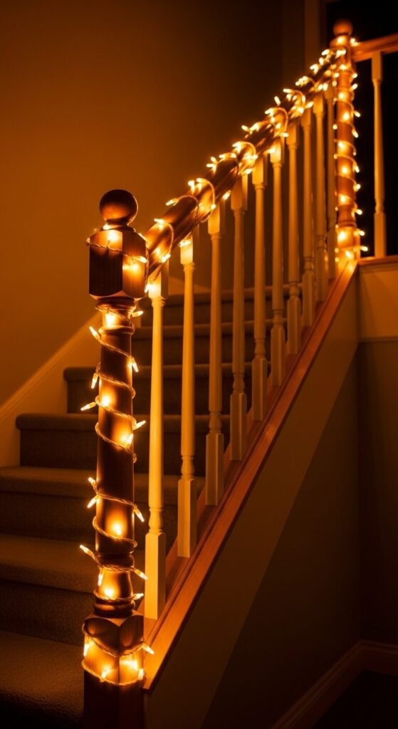 Wrapping string lights around a staircase banister or handrail is one of the most dramatic indoor string light placements — the lights follow the architectural line of the staircase and illuminate both the railing and the surrounding stairwell in warm, moving pools of amber light as you move up or down. Use a plug-in strand with a cord long enough to reach from the nearest outlet to the full length of the banister. Secure with small zip ties or wraps of clear tape at intervals to keep the strand from slipping. A 20-foot strand of micro lights wraps a standard single-flight banister once. Add a second strand for a fuller, denser wrap. Cost: $10 to $20 total.