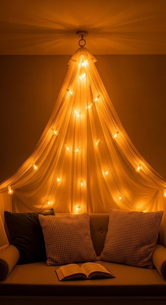 A string light canopy suspended above a reading nook — gathered from a ceiling hook at the center and allowed to spread outward and drape down at the sides — creates a private, tent-like sense of enclosure that makes any corner feel like a destination. Attach four to six strands to a single central ceiling hook using a ring or knot, then drape each strand outward to a separate wall hook at its far end. The gathered center point creates the canopy apex and the draped edges define the canopy walls. Four strands of warm micro lights cost $30 to $50 total. A single ceiling hook costs $3. No tools required beyond a small drill or a strong adhesive hook.