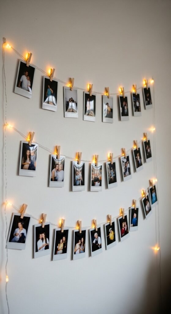 A string of lights with small photo clips or wooden clothespins attached creates a living gallery wall that is easy to change, costs almost nothing to install, and produces a warm, personal display that no framed gallery wall can replicate. Use a horizontal strand of micro lights stretched taut between two wall hooks, with small wooden clothespins clipped to the strand at regular intervals to hold photos, Polaroids, postcards, or printed images. A 10-foot strand with 20 wooden clips costs $8 to $15 as a set from Amazon, or you can use a plain strand and add craft store clothespins for $2 to $3 a pack. Three horizontal rows creates a full feature wall display for under $40 total.