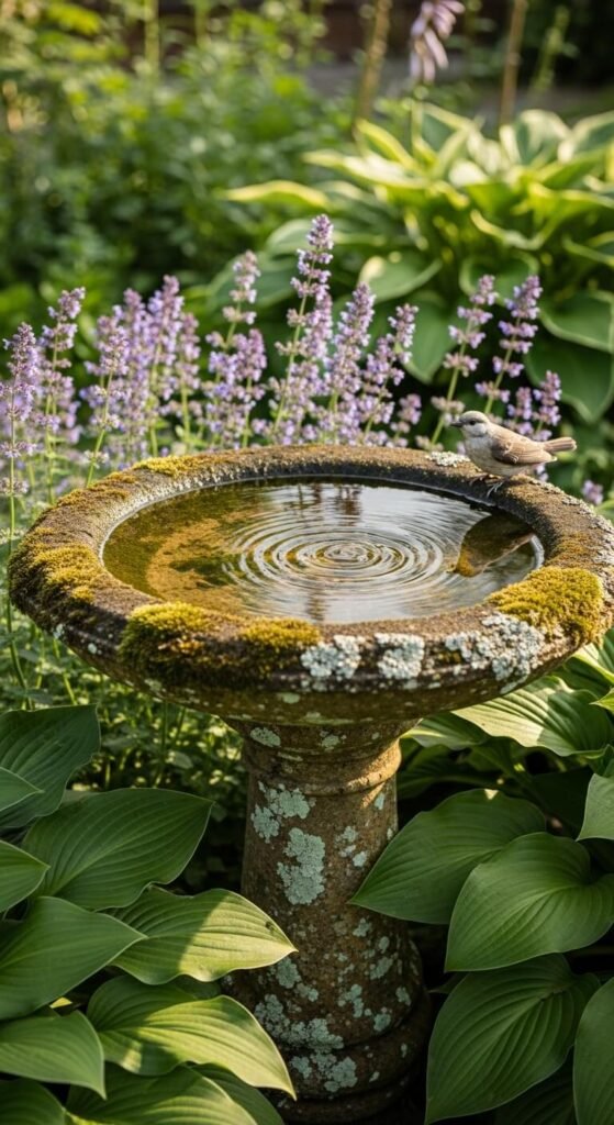 A stone birdbath does double duty — it attracts wildlife and anchors a garden bed visually. Place it at eye level from your most-used seating area so you can watch birds from a comfortable distance. Aged, mossy stone birdbaths look far more natural than new plastic ones. Check antique stores, estate sales, or Facebook Marketplace for old birdbaths at a fraction of retail price. Clean the basin weekly with a stiff brush and refill with fresh water. Even a basic concrete version aged with a yogurt-and-water brushing develops a natural moss patina within a few months.