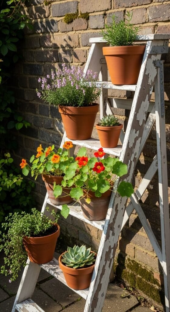 An old wooden ladder propped against a wall makes a charming vertical plant display. Sand it down and apply a coat of exterior paint in a muted tone — chalky white, sage green, or faded blue all work beautifully. Sit terracotta pots on each rung, varying the plants for color and texture. Trailing nasturtiums, herbs, and small succulents all look great at different heights. Old ladders turn up frequently at salvage yards, boot sales, and charity shops for $5 to $15. The height variation draws the eye upward and makes good use of vertical wall space in smaller gardens.