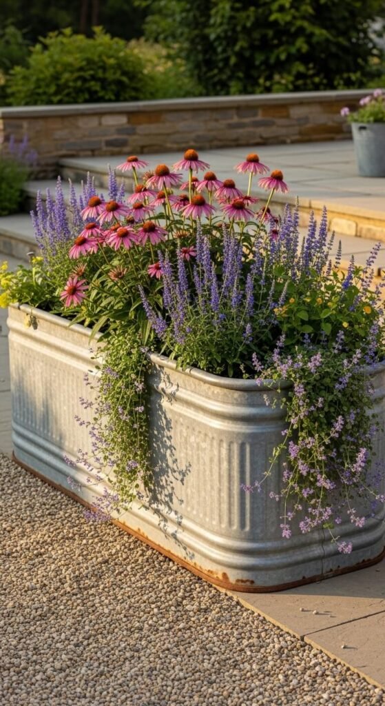 Galvanized metal troughs are one of the most practical and attractive large container choices for a garden. Drill drainage holes in the base before planting — this is the only preparation needed. Fill with a mix of topsoil, compost, and grit for best drainage. Plant densely with perennials for a naturalistic look that improves every year. New galvanized troughs from farm supply stores cost $40 to $80 depending on size. Secondhand ones from farm sales cost much less and already have the aged patina that makes them look beautiful. One large trough planted well becomes a complete garden feature on its own.