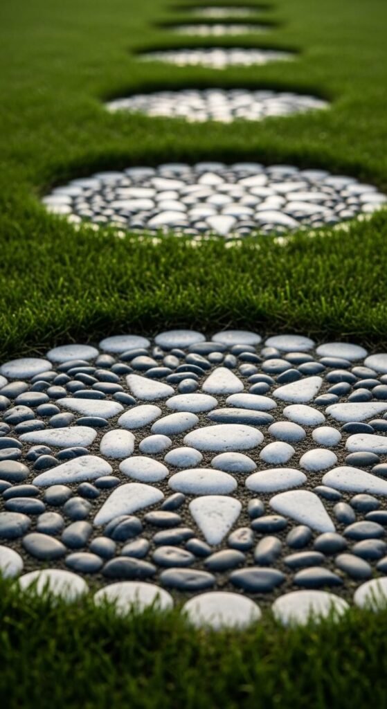 Handmade pebble mosaics are a slow but deeply rewarding garden project. Set smooth river pebbles into mortar within a simple circular or square wooden frame, then set the whole piece into the ground. A simple geometric pattern — a spiral, sunburst, or leaf shape — looks impressive without requiring artistic skill. River pebbles in mixed sizes cost around $5 to $10 for a bag. Mortar mix costs around $5. One mosaic pad takes an afternoon to make and lasts for decades outdoors. Place them at garden junctions or at the edge of a patio to mark the start of a path.