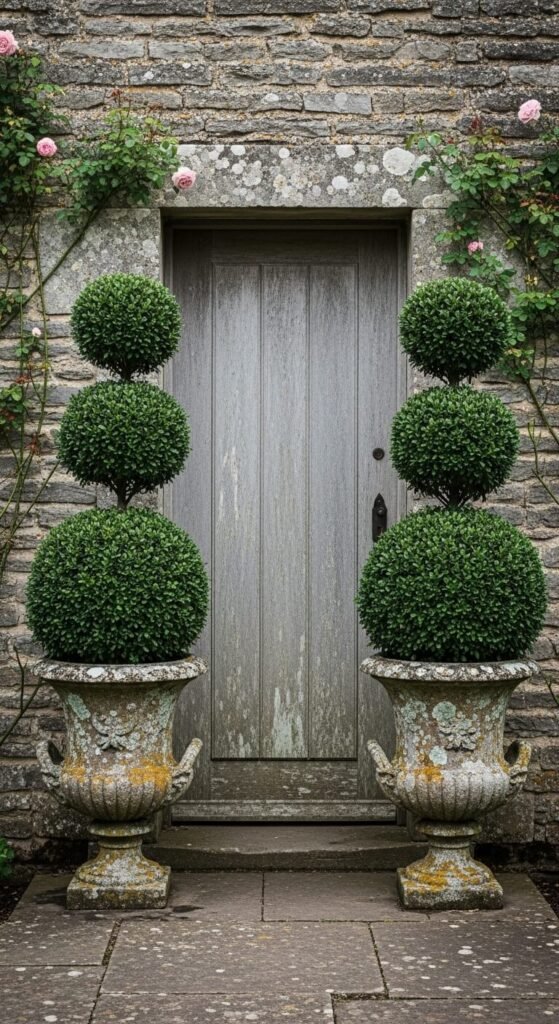 A pair of clipped topiary shapes in matching urns adds instant formal structure to any garden entrance. Box, yew, or privet all respond well to clipping and are readily available as young plants. Start with a young bushy plant, clip it into a rough ball, and refine it each season — a proper sphere takes two to three years to develop. Aged stone or terracotta urns look far more convincing than plastic ones. Secondhand stone urns from garden auctions or salvage yards are available from around $20 each. Clip twice a year — once in late spring and once in late summer — for a tidy form year-round.