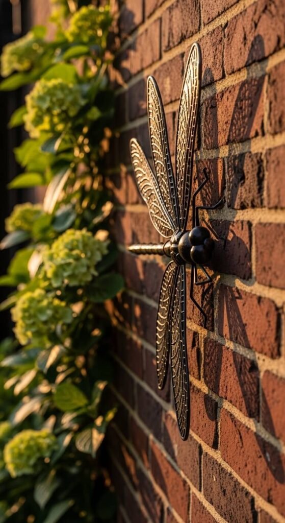 Metal wall art adds dimension to a flat fence or wall without taking up any ground space. Choose a large, simple silhouette — dragonflies, butterflies, herons, and branches all work well at scale. A piece that is too small gets lost on a wide wall. A single bold piece around 24 to 36 inches works far better than several small ones scattered randomly. Powder-coated steel or laser-cut corten steel both weather beautifully outdoors. Prices range from $20 to $60 for online pieces in these sizes. Fix securely with stainless steel screws — rust from regular screws will stain the wall over time.
