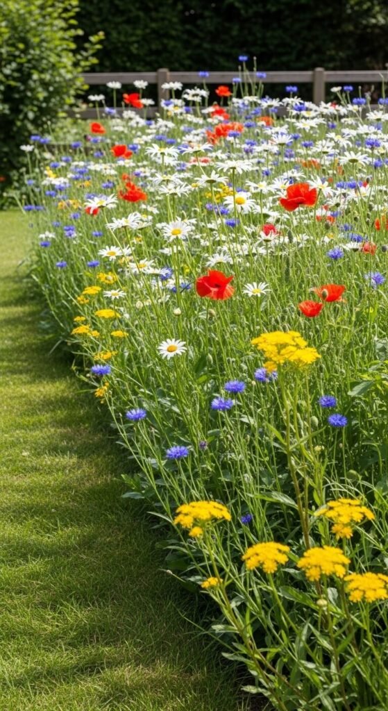 A wildflower patch is the most affordable and ecologically rich garden decor idea on this list. Stop mowing a section of lawn and scatter a wildflower seed mix in early autumn or spring. Annual mixes dominated by poppies, cornflowers, and phacelia bloom in the first year. Perennial mixes take two years but return reliably each season. A 50g pack of wildflower seed costs around $4 and covers a surprisingly large area. Mow a clean edge along one side — this signals that the meadow is intentional rather than neglected. The contrast between tidy lawn and wild blooms looks beautiful from any angle.
