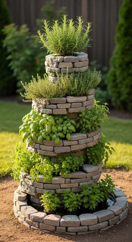 A herb spiral is a practical garden structure that is also genuinely beautiful as a garden feature. Stack natural stone, brick, or timber in a rising spiral pattern about three feet high. The different micro-climates created at each level suit different herbs — drought-tolerant rosemary and thyme at the top, moisture-loving mint at the base. The spiral shape looks sculptural from any angle. Materials can be entirely salvaged: old bricks, broken slate, or rough-cut stone all work. Herbs themselves are inexpensive as small plants or easy to grow from seed. The whole structure costs as little as $20 in materials if you source stone locally.