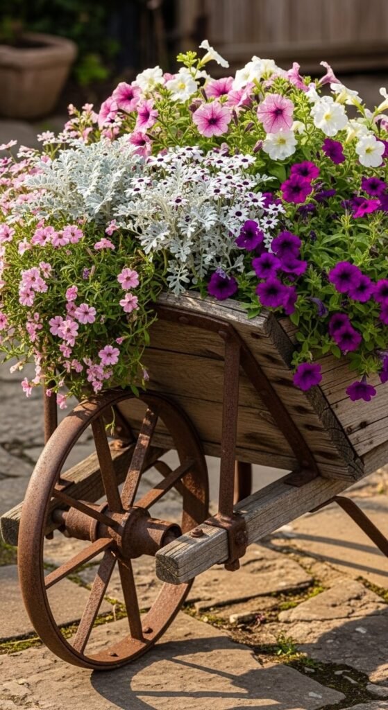 An old wheelbarrow overflowing with cottage garden plants is the kind of thing that makes visitors stop and smile. Drill drainage holes in the base and line with landscape fabric before filling with compost. Plant densely with trailing and mounding flowers for maximum impact. Position it as a focal point at a path junction or beside a gate. Old wooden wheelbarrows with iron wheels turn up at farm auctions and salvage yards for very little money. Even a rusty, broken-wheeled one works perfectly as a static planter — the imperfections add to the character rather than detracting from it.