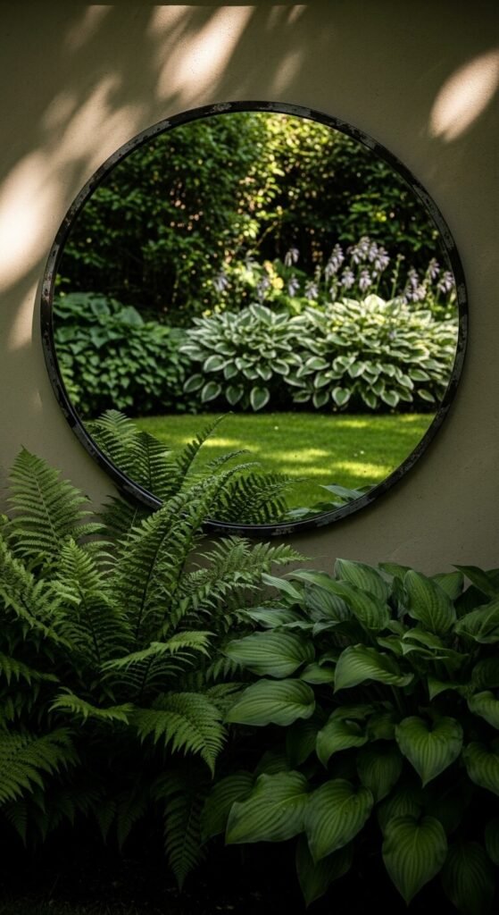 Outdoor mirrors are one of the most effective tricks for making a small garden feel larger. Mount a large round or rectangular mirror on a shaded wall — shade prevents glare and makes the reflection more convincing. The reflection doubles the visible planting in front of it, creating the illusion of a second garden beyond the wall. Use a mirror designed for outdoor use with a sealed frame — indoor mirrors delaminate in wet conditions. A large round outdoor mirror costs around $40 to $80. Position it so it reflects your best planting, not a fence panel or sky.
