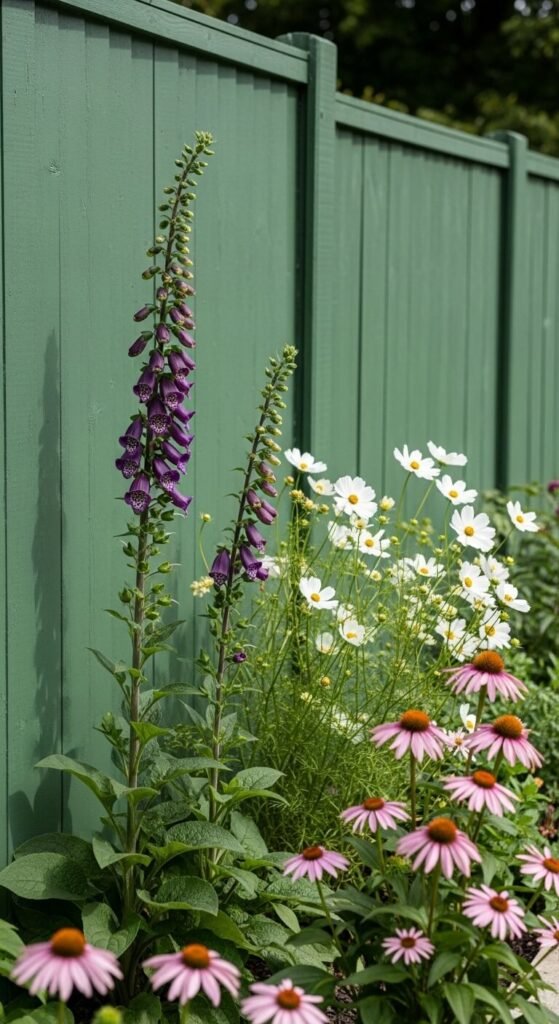A single panel or run of fence painted in a deep, saturated color becomes a garden feature in its own right. Deep sage green, charcoal, slate blue, or black all work beautifully as backdrops for flowering plants. The contrast between a dark fence and pale flowers is particularly striking. Exterior fence paint costs around $15 to $25 for a tin that covers several panels. Paint just one or two panels behind a key border rather than the whole garden — restraint makes the color feel deliberate rather than overwhelming. The effect is instant and transformative, especially in a smaller garden.