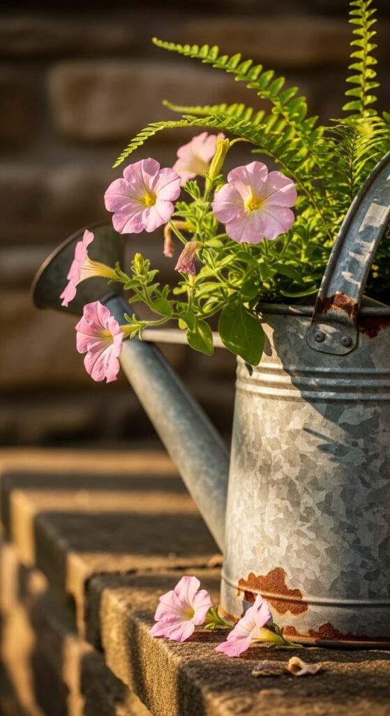 Old watering cans planted with cascading flowers are one of the most charming small-space garden decor ideas. Drill drainage holes in the base before filling with compost and planting. Trailing petunias, ivy-leaved pelargoniums, or lobelia work especially well spilling over the sides. Vintage galvanized cans are widely available at car boot sales, junk shops, and charity stores for around $3 to $8. Even a rusty, dented one with character looks intentional when planted up. Group two or three different sizes together on a wall or step for maximum impact without spending more than $15 total.