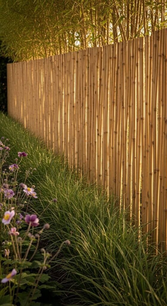 Bamboo screens add instant warmth and a natural backdrop to a garden border. Fix bamboo roll fencing to an existing fence or free-standing posts for a quick transformation. It softens hard brick or concrete boundaries and creates a neutral warm backdrop that makes plant colors pop. Bamboo roll fencing costs around $15 to $25 for a 13-foot roll and lasts four to six years outdoors. Treat it annually with an outdoor wood oil to extend its life. Use it behind a border of ornamental grasses or tall perennials to create layered depth and a sense of enclosure.