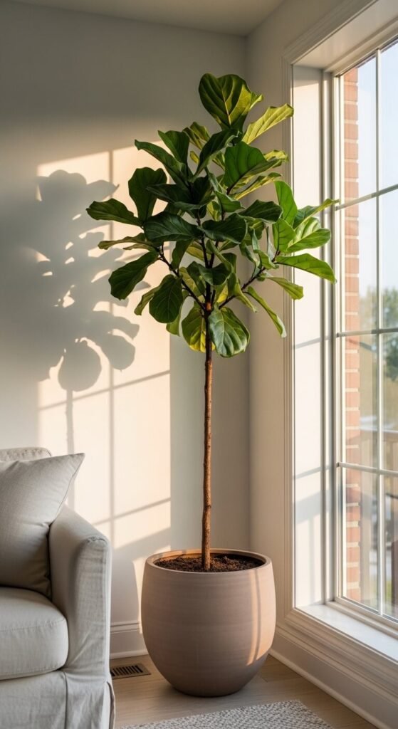 Buy a smaller plant and let it grow — nursery fiddle leafs start around $15–$30. Use a large pot with drainage and a saucer underneath. Water only when the top two inches of soil are dry. This plant rewards patience and consistent care with dramatic, room-changing results.