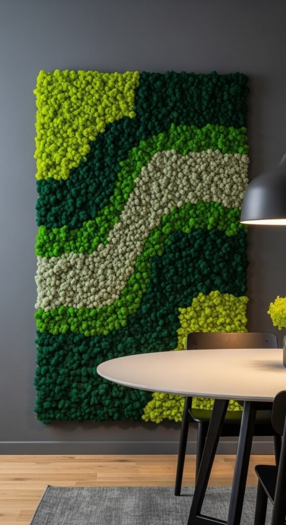 DIY moss wall kits are available on Amazon and Etsy for $40–$120 depending on size. Arrange different moss varieties — sheet moss, reindeer moss, ball moss — in a shadow box frame or directly on the wall using liquid nails.