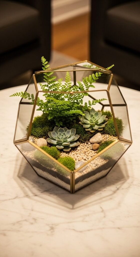 Geometric brass-framed terrariums cost $20–$60 at HomeGoods, TJ Maxx, or Amazon. Fill with activated charcoal, potting mix, and small plants from your local nursery. Total project cost: $35–$80. Lasts years with minimal attention.
