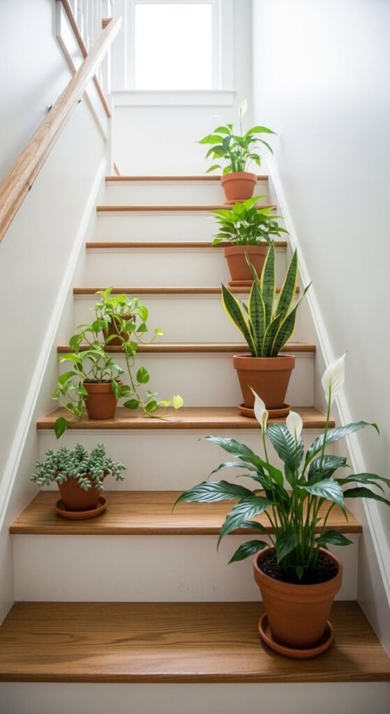 Start with smaller plants at the top and graduate to larger ones at the bottom, following the diagonal line of the stairs. It creates a cascading green display that looks fully intentional and costs almost nothing to arrange.