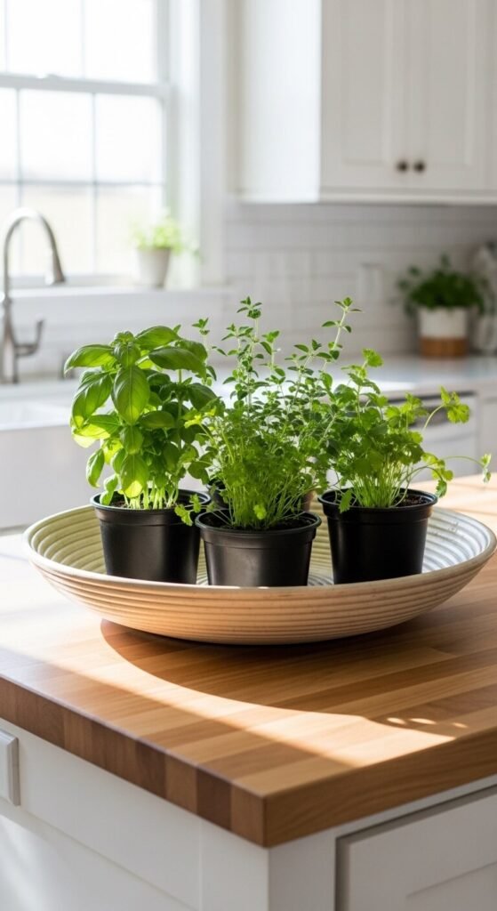 Group three to five herb pots inside a wide, shallow basket to keep them contained, mobile, and styled. You can move the whole arrangement to the windowsill for more light during the day and bring it back to the island for visual impact.