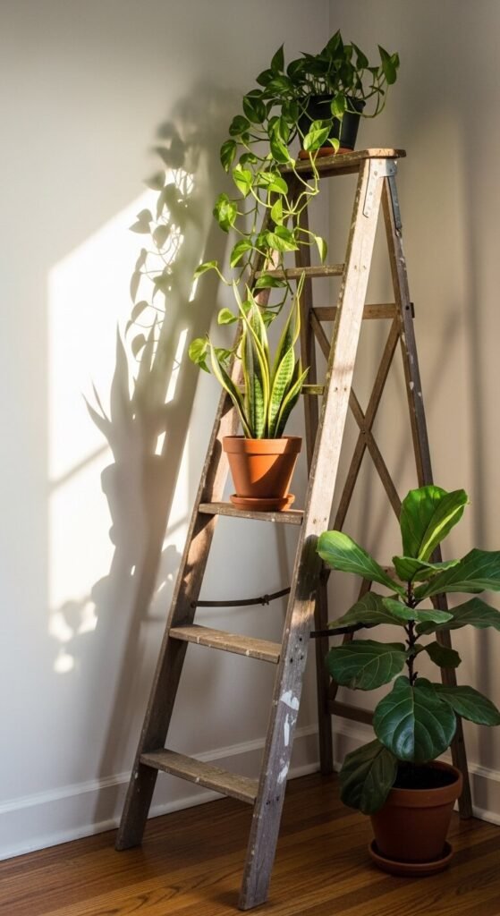 Find old wooden ladders at flea markets, estate sales, and Facebook Marketplace for $10–$40. Paint it or leave it raw depending on your interior style. Four to six plants on a ladder costs less than a single purpose-built plant stand and looks considerably more interesting.