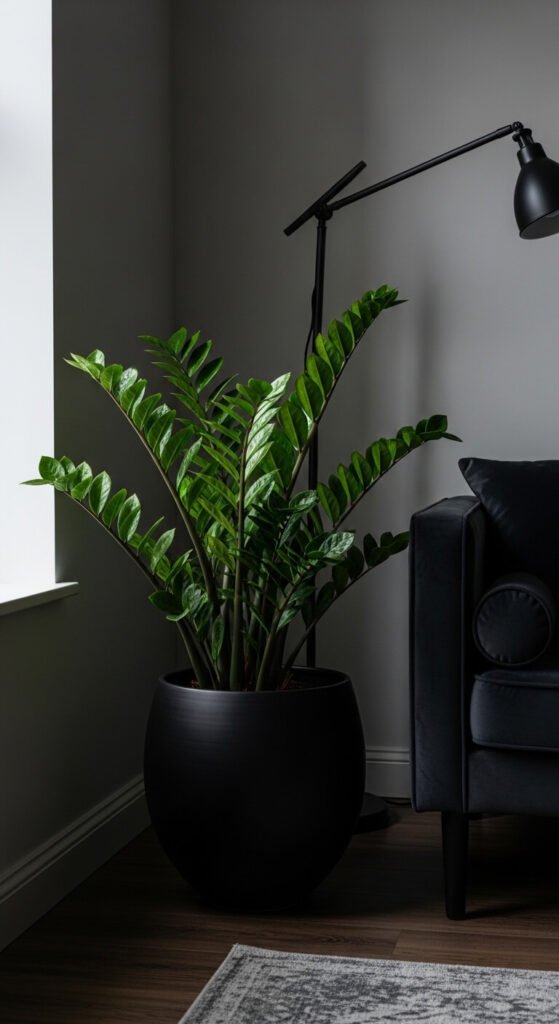 A ZZ plant in a matte black or deep green pot looks stunning in a dim corner that would kill almost any other plant. Water once a month in low-light conditions. Nursery ZZ plants cost $12–$35 depending on size, and they genuinely require almost no care once placed.