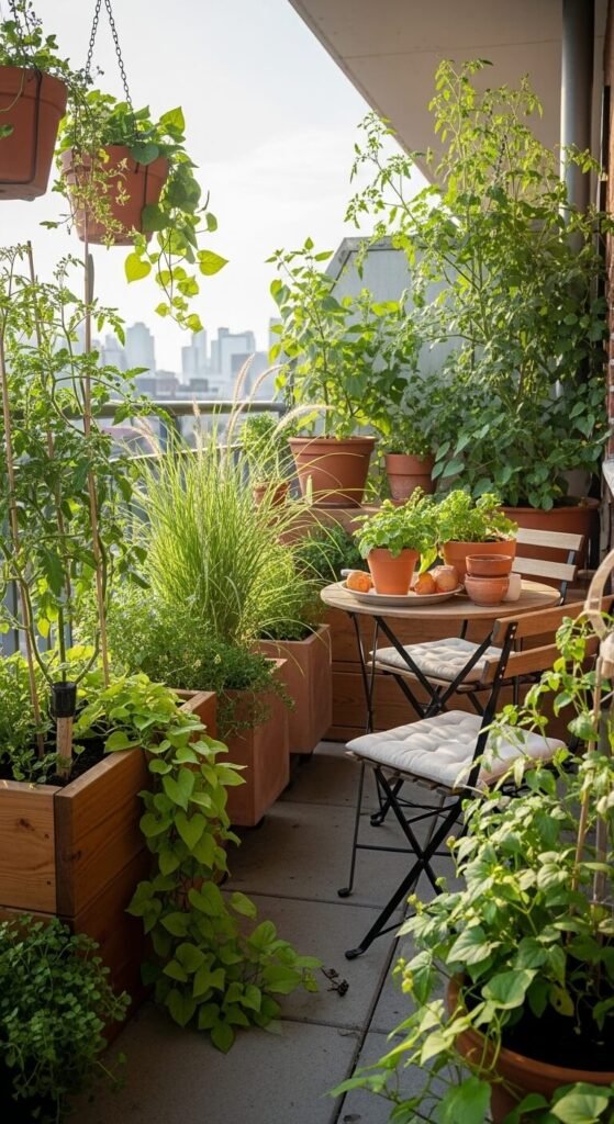 Use a mix of large terracotta pots, wooden planter boxes, and hanging baskets to create a layered, abundant feel. Grow vegetables, herbs, flowering annuals, and ornamental foliage together for a display that’s both beautiful and productive.