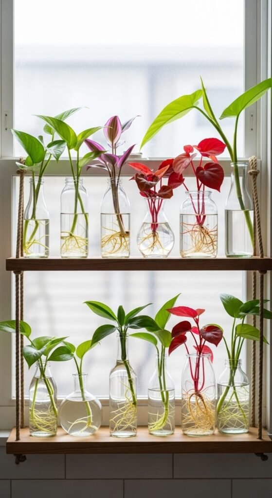 Line a sunny window shelf with small glass vessels — old medicine bottles, bud vases, test tubes, or even repurposed spice jars — and fill them with plant cuttings in water. As roots develop, the display changes weekly, giving it a living, evolving quality.