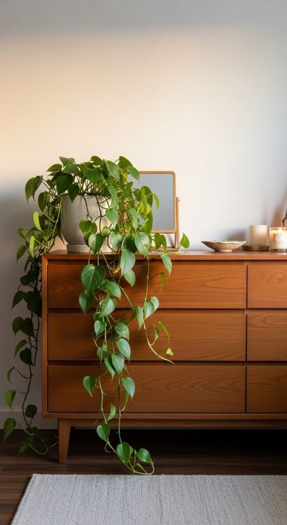 Place a single large trailing plant at one end of the dresser and let the vines grow naturally across the surface and over the edge. No guides, no training needed — just growth. The longer it grows, the more beautiful it becomes.