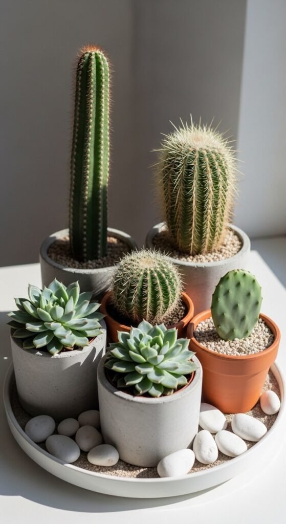 A desert vignette groups cacti and succulents into a small-scale landscape that looks like it belongs in a design magazine.