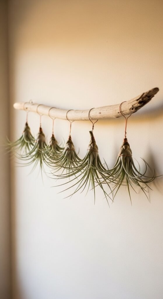 Soak air plants in water for 20 minutes weekly, shake off excess, and let them dry upside down before returning to the display. Individual air plants cost $3–$12. A piece of driftwood from a craft store or beach runs $5–$20. The complete installation costs under $60.