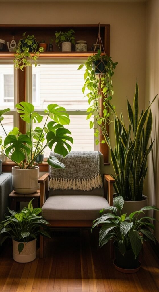 Use plants that tolerate the light available in that specific spot. Snake plants and ZZ plants work in dimmer corners; monstera and pothos prefer brighter spots. The whole arrangement can be built from four to six affordable plants for under $80 total.