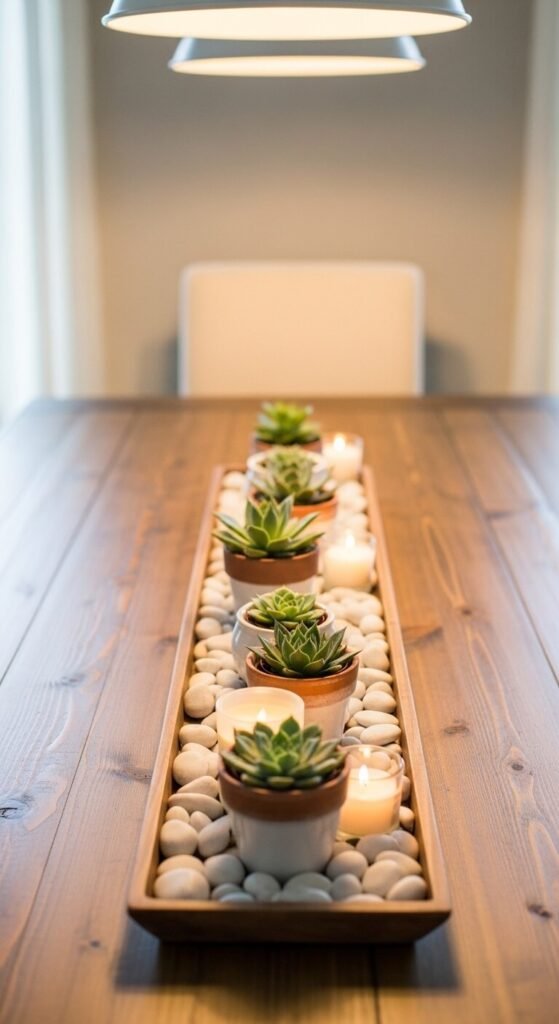 A low tray of succulents running down the center of a dining table is a living centerpiece that stays beautiful for months.