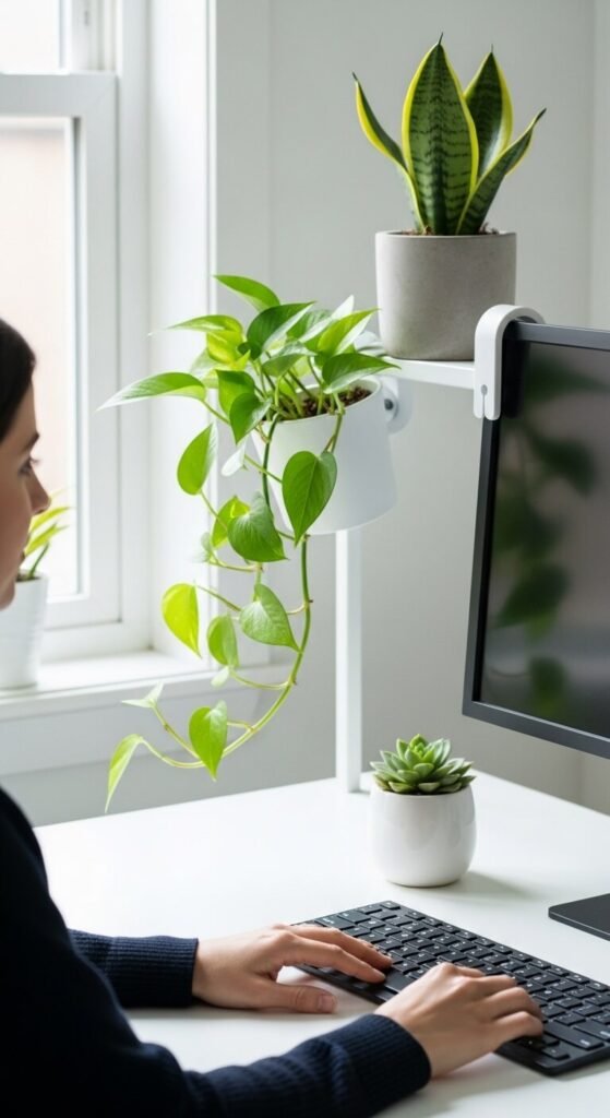 Monitor clip planters are available on Amazon for $10–$15 and hold small trailing plants directly on the screen edge. Snake plants and ZZ plants handle the lower light common in office corners. Total desk plant setup: $30–$50.