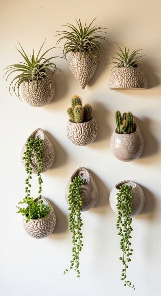 Individual wall-mounted ceramic planters are widely available on Etsy and Amazon for $8–$20 each. Arrange nine to fifteen of them in a loose grid or organic cluster, each holding a different small plant or air plant.