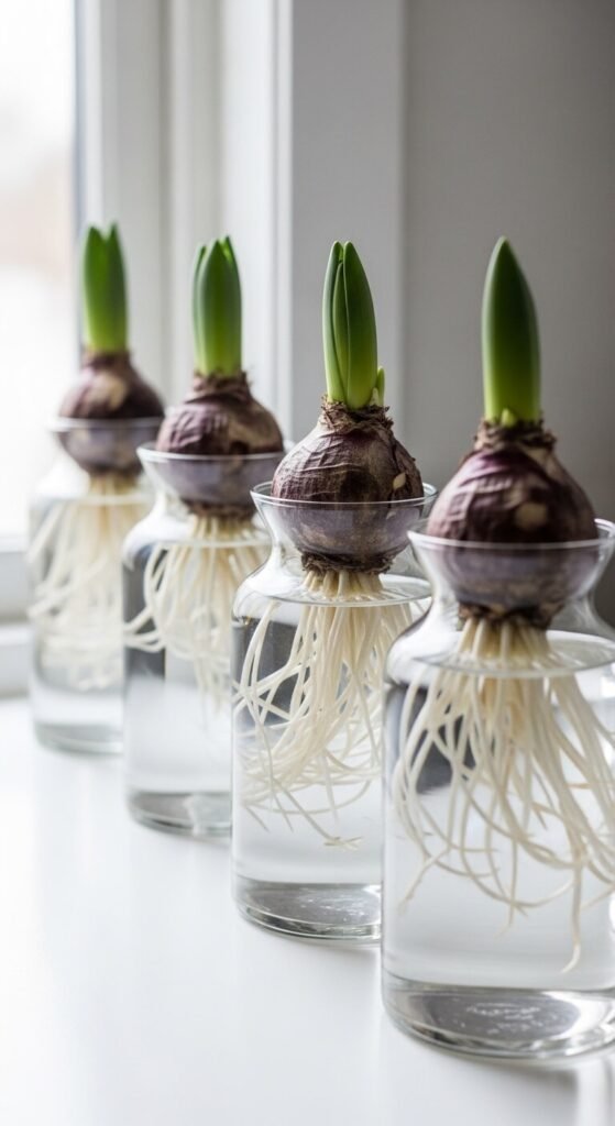 Place hyacinth, paperwhite, or amaryllis bulbs in forcing vases or shallow dishes of water and set them in a cool, bright spot. Within two to four weeks, roots develop below and flowers emerge above — and the whole process is visible through the glass.
